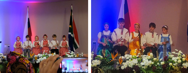 Guests were welcomed with a unique blend of Russian and South African traditions. The African Union Choir from Soweto opened the evening with stirring a cappella renditions of both national anthems. The Lozhkari, a folk instrumental ensemble from the Russian School in Pretoria, provided musical entertainment for the evening. Russian vodka, South African sherry and wine, along with warm, traditional dishes from both nations, were served to guests gathered on a crisp Highveld evening.