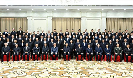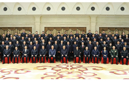 Chinese President Xi Jinping, also general secretary of the Communist Party of China Central Committee and chairman of the Central Military Commission, poses for a group photo while meeting with representatives of judicial workers and police officers in Urumqi, northwest China's Xinjiang Uygur Autonomous Region, Sept. 23, 2025. (Xinhua/Ding Lin)