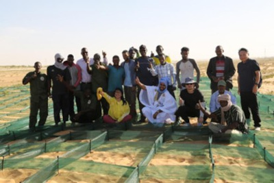 Researchers from the Xinjiang Institute of Ecology and Geography under the Chinese Academy of Sciences and local workers pose for a group photo at the China-Africa Green Technology Park in Trarza region, western Mauritania, in May 2024. (Photo by Zhou Na/Xinhua)