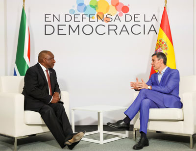 President Cyril Ramaphosa holds a bilateral meeting with President Pedro Sánchez of the government of Spain at the Fira de Barcelona ahead of the In Defence of Democracy Initiative during working visit to the Kingdom of Spain (photo: Jairus Mmutle/GCIS)